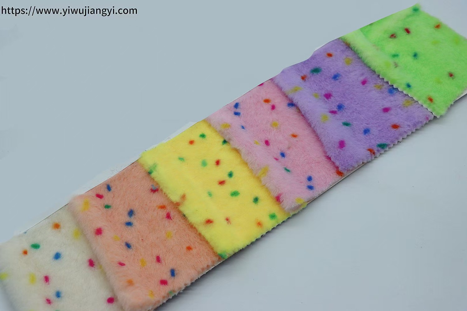 This Multi-color Speckled Plush Fabric Swatch includes colors such as off-white, light orange, yellow, pink, purple, and green. The fabric is dotted with colorful dots, soft and fluffy, full of childlike fun and vitality. It is suitable for design and production reference in fields such as children's clothing, toys, and home decoration (e.g., pillows, carpets), providing manufacturers and designers with a wealth of color and pattern choices to help create product series that are both interesting and warm.